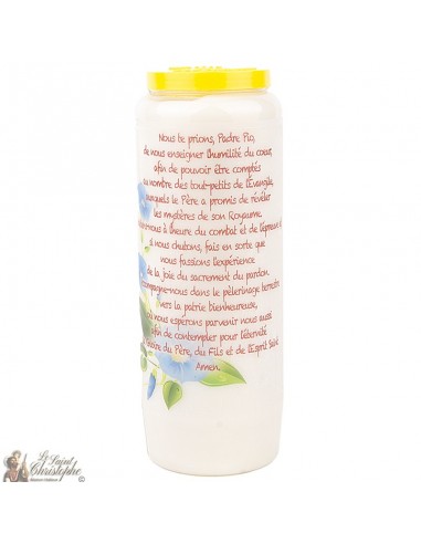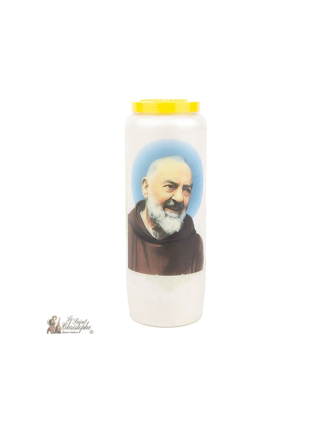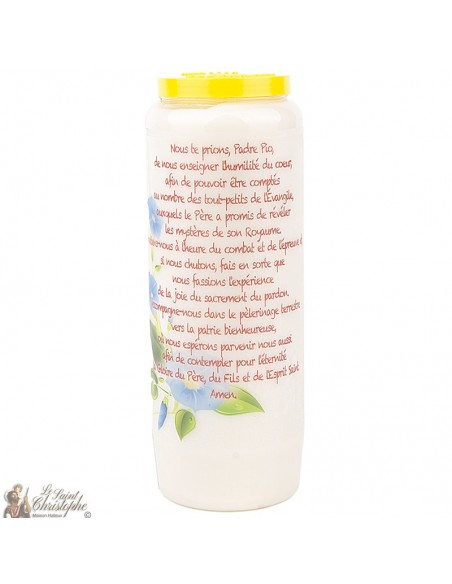 Bougie de neuvaine blanche avec image du Padre Pio et prière qui lui est dédiée.