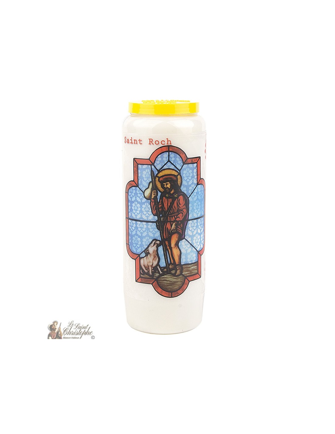 Bougie de neuvaine blanche avec image de Saint Roch et prière qui lui est dédiée.