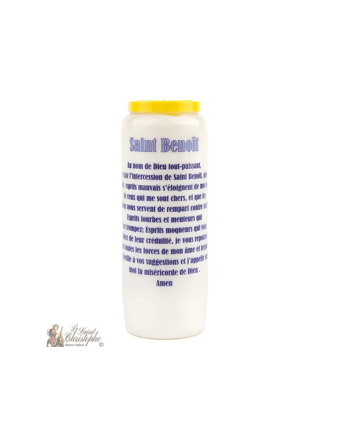 Bougie de neuvaine blanche avec image de l'image de Saint Benoît en bleu et prière qui lui est dédiée.