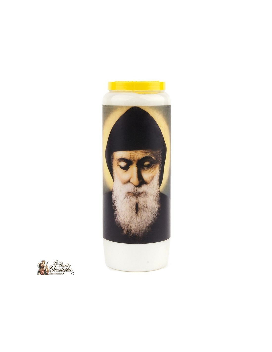 Bougie de neuvaine à l'image de Saint Charbel et prière au dos.