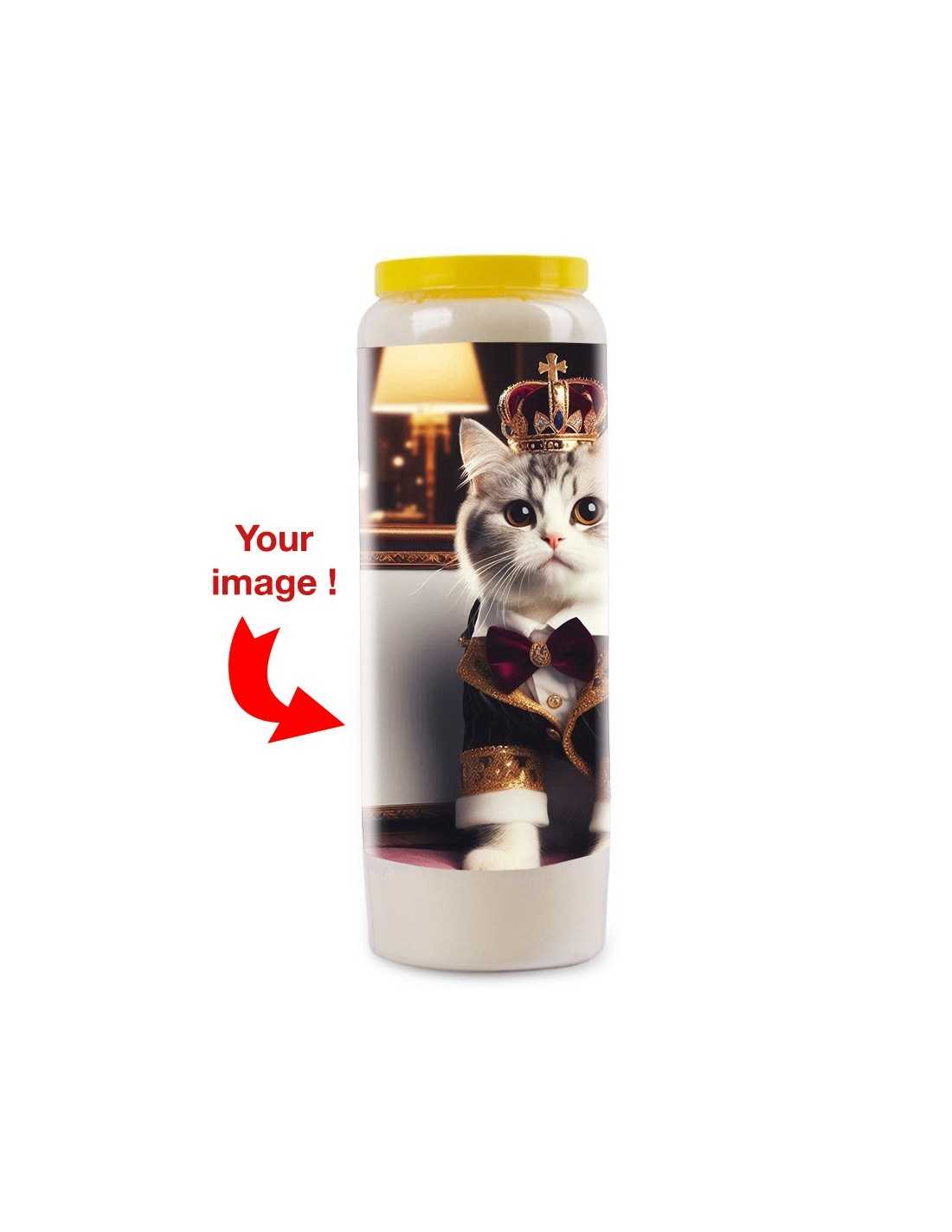 Offrez une touche d’élégance et d’originalité avec cette bougie de neuvaine unique. Un clin d'œil raffiné et amusant pour tous les amoureux des chats ! Ce modèle représente un chat blanc tigré à poils courts en habits royaux, avec un cadre à personnaliser.