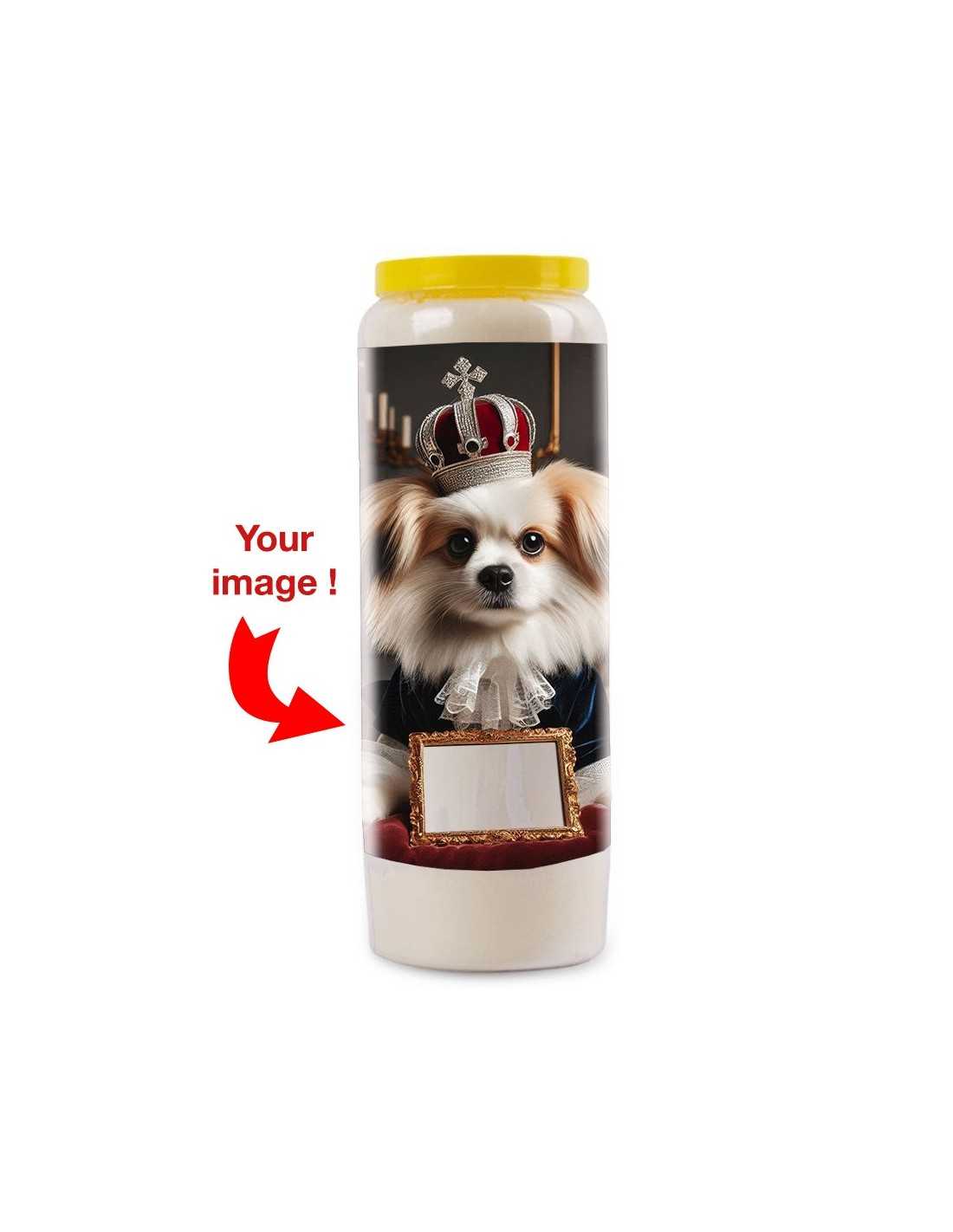 Offrez une touche d’élégance et d’originalité avec cette bougie de neuvaine unique. Un clin d'œil raffiné et amusant pour tous les amoureux des chiens ! Ce modèle représente un chien épagneul en habits royaux, avec un cadre à personnaliser.