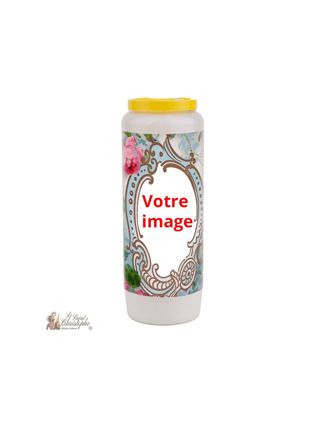 Bougie neuvaine végétale avec l'image de votre choix à l'avant et prière à l'arrière dédiée à une personne proche décédée.