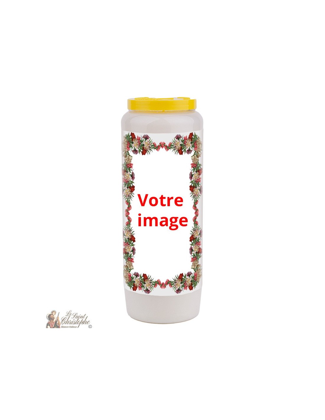Bougie neuvaine végétale avec l'image de votre choix à l'avant et prière à l'arrière dédiée à une personne proche décédée.