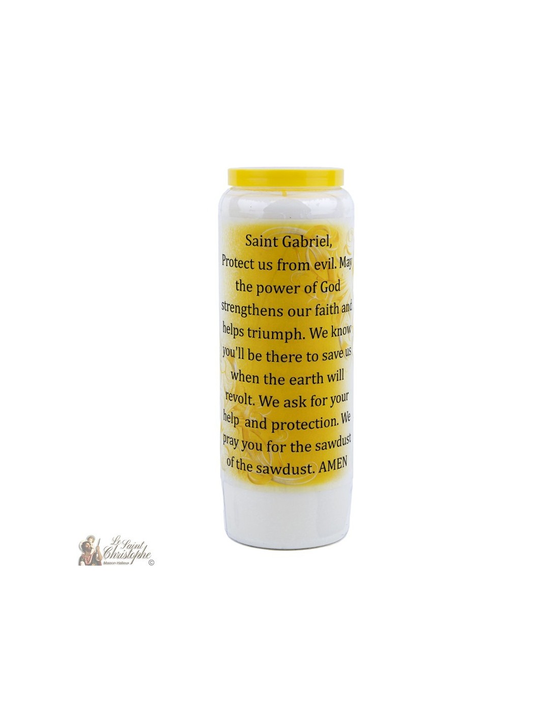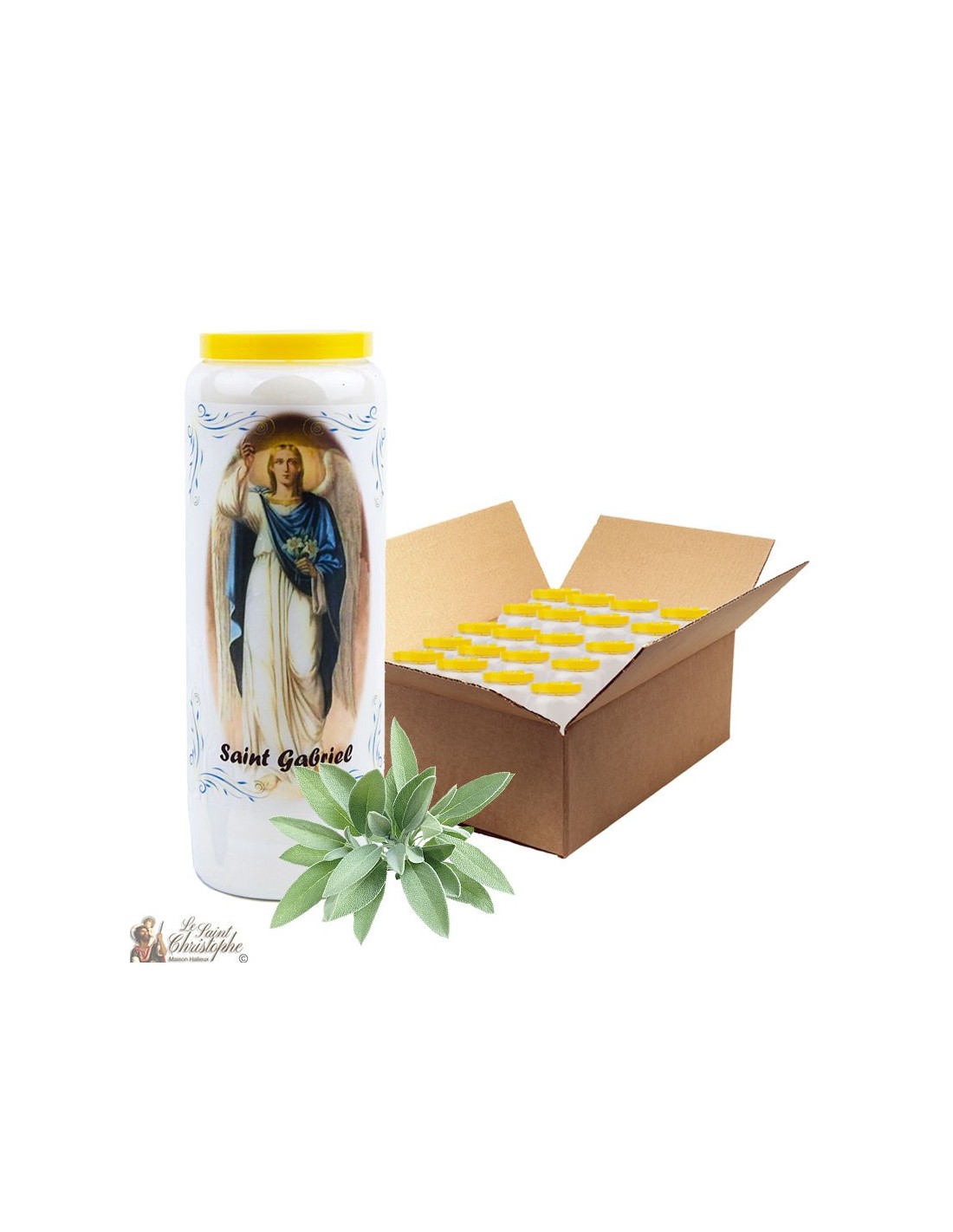 Bougie neuvaine végétale avec image et prière à Saint Gabriel, parfumée à la sauge. Une combinaison parfaite pour une purification des lieux et de soi. Un carton contient 20 bougies.