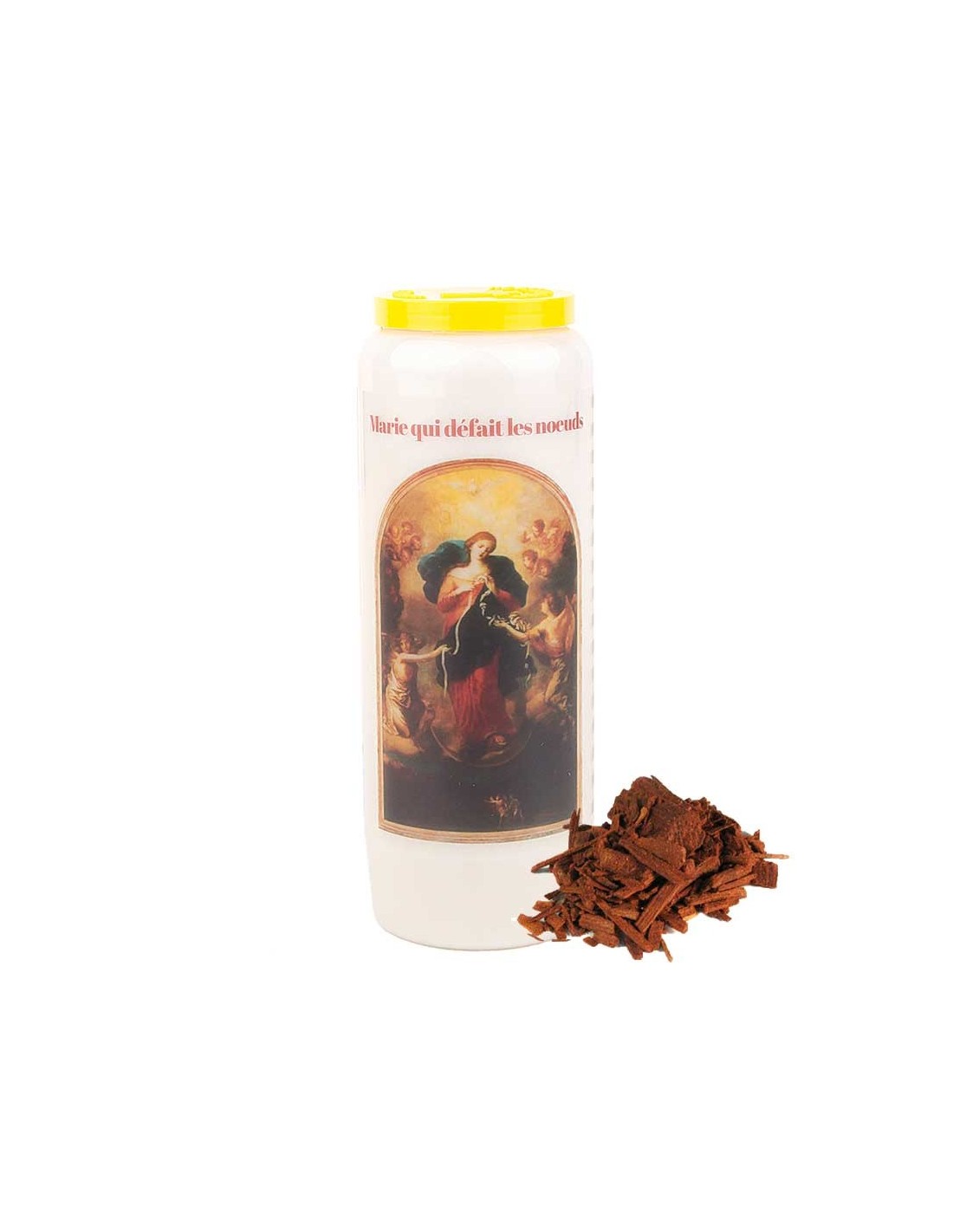 Bougie neuvaine végétale parfumée au bois de santal avec image de Marie qui défait les nœuds et prière qui lui est dédiée à l'arrière. Elles est à prier . Une combinaison parfaite pour une purification de l'air.