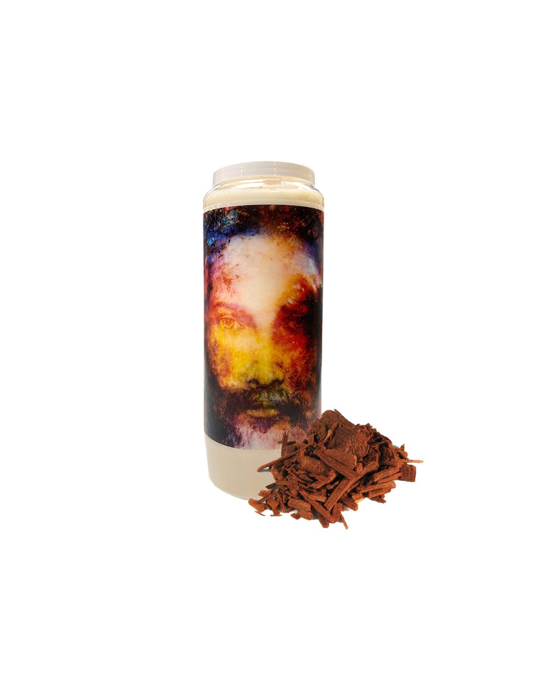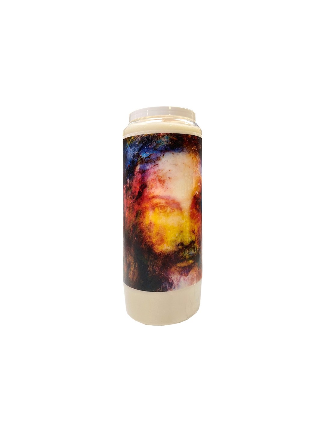 Bougie neuvaine végétale parfumée au bois de santal avec image de Jésus Christ en peinture moderne et colorée. La combinaison du bois de santal et de Jésus donne un effet purificateur de l'air et aide à la guérison.