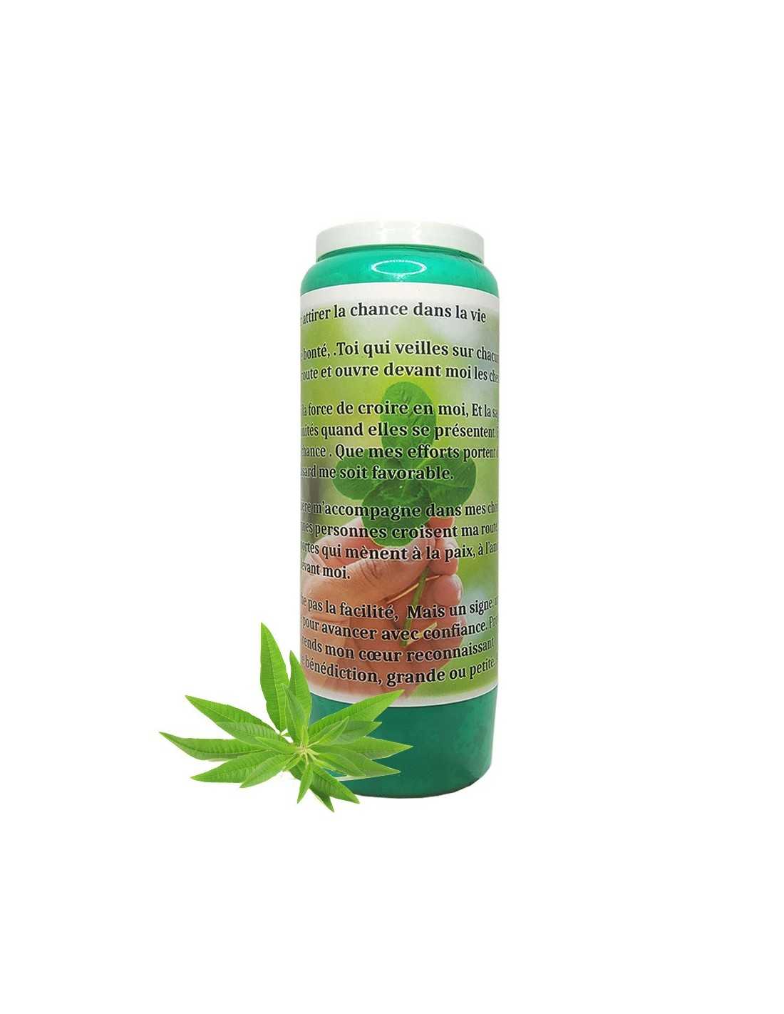 Bougie de neuvaine avec image d'un trèfle à 4 feuilles et prière pour attirer la chance dans la vie, couleur verte et délicatement parfumée à la verveine.