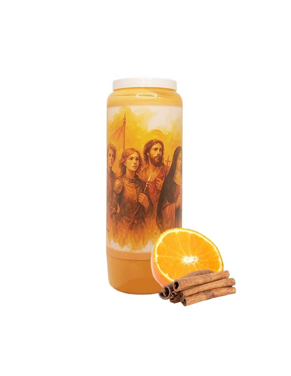 Bougie de neuvaine avec image de quatre saints protecteurs : Sainte Hildegarde, Saint Jean-Baptiste, Sainte Jeanne d'Arc et l'Archange Saint Michel. La prière au dos est destinée à la Flamme Vive, une ode à la joie et une demande d'intercession des 4 saints. La bougie est parfumée à l'orange et la cannelle, une fragrance vivifiante.