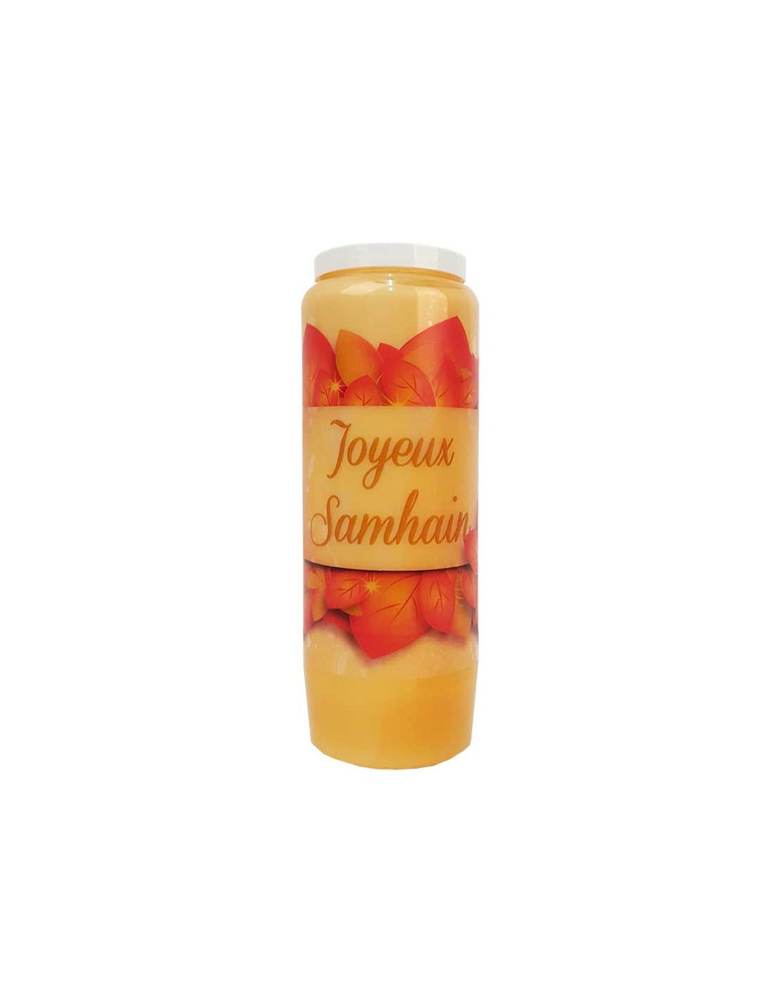 Bougie de neuvaine orange avec une image de feuilles d'automne et de l'inscription Joyeux Samhain. L'image est transparente pour un effet photophore.
