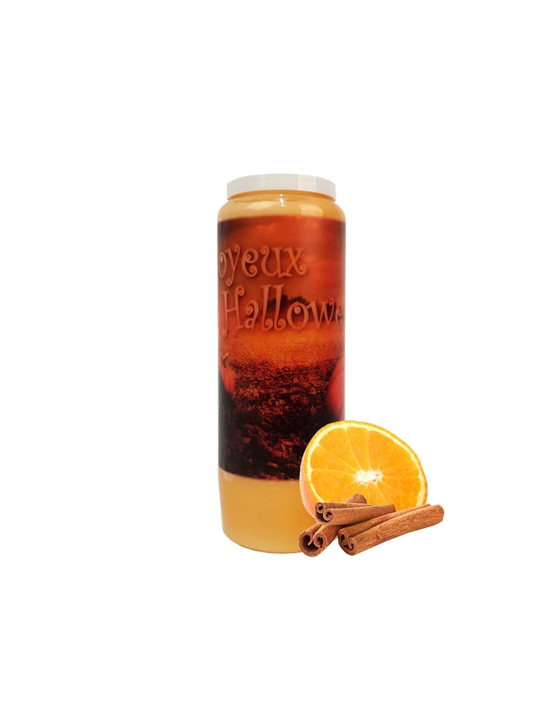 6Bougie de neuvaine parfumée à la cannelle et à l'orange, avec un décor de citrouilles en forêt et un Joyeux Halloween inscrit. L'étiquette est translucide pour un effet photophore.