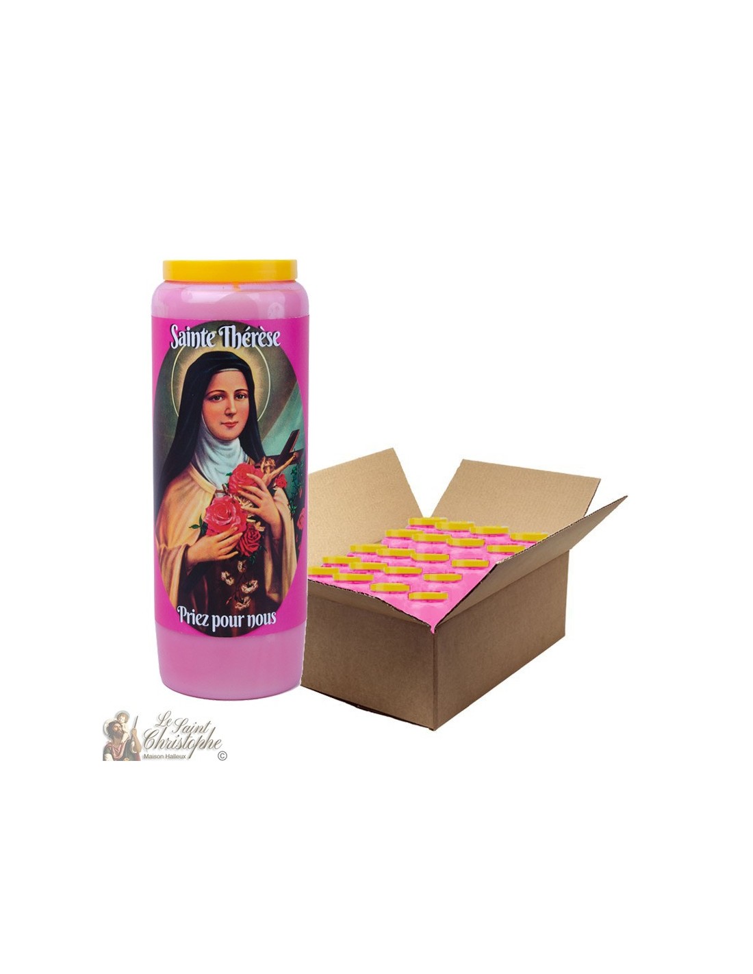 Candela di novena vegetale con un'immagine di santa Teresa di Lisieux e la preghiera in fondo nella lingua di vostra scelta. - Una scatola contiene 20 candele Novena.