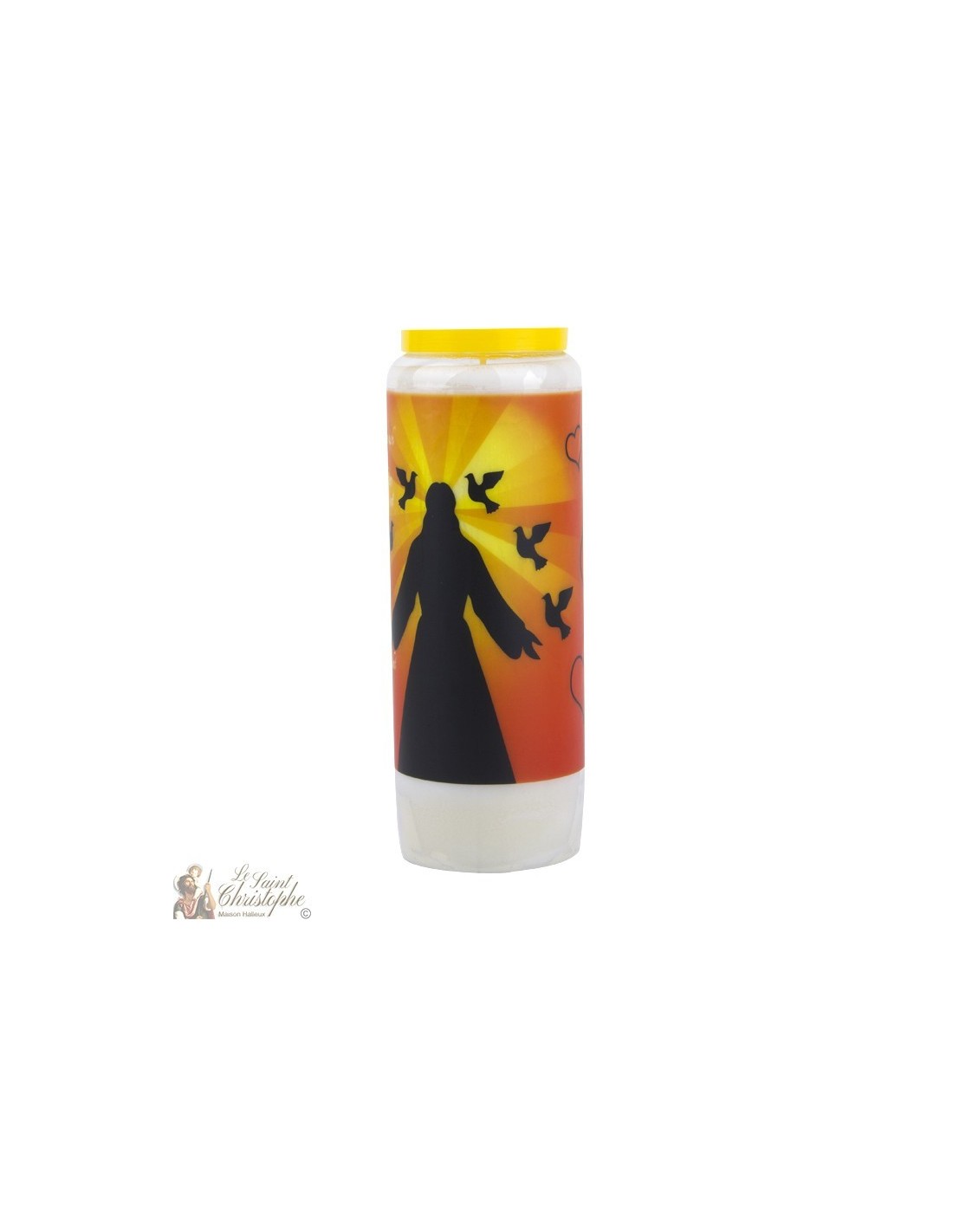Candela della novena con immagine di Gesù Cristo e preghiera dedicata a Dio.