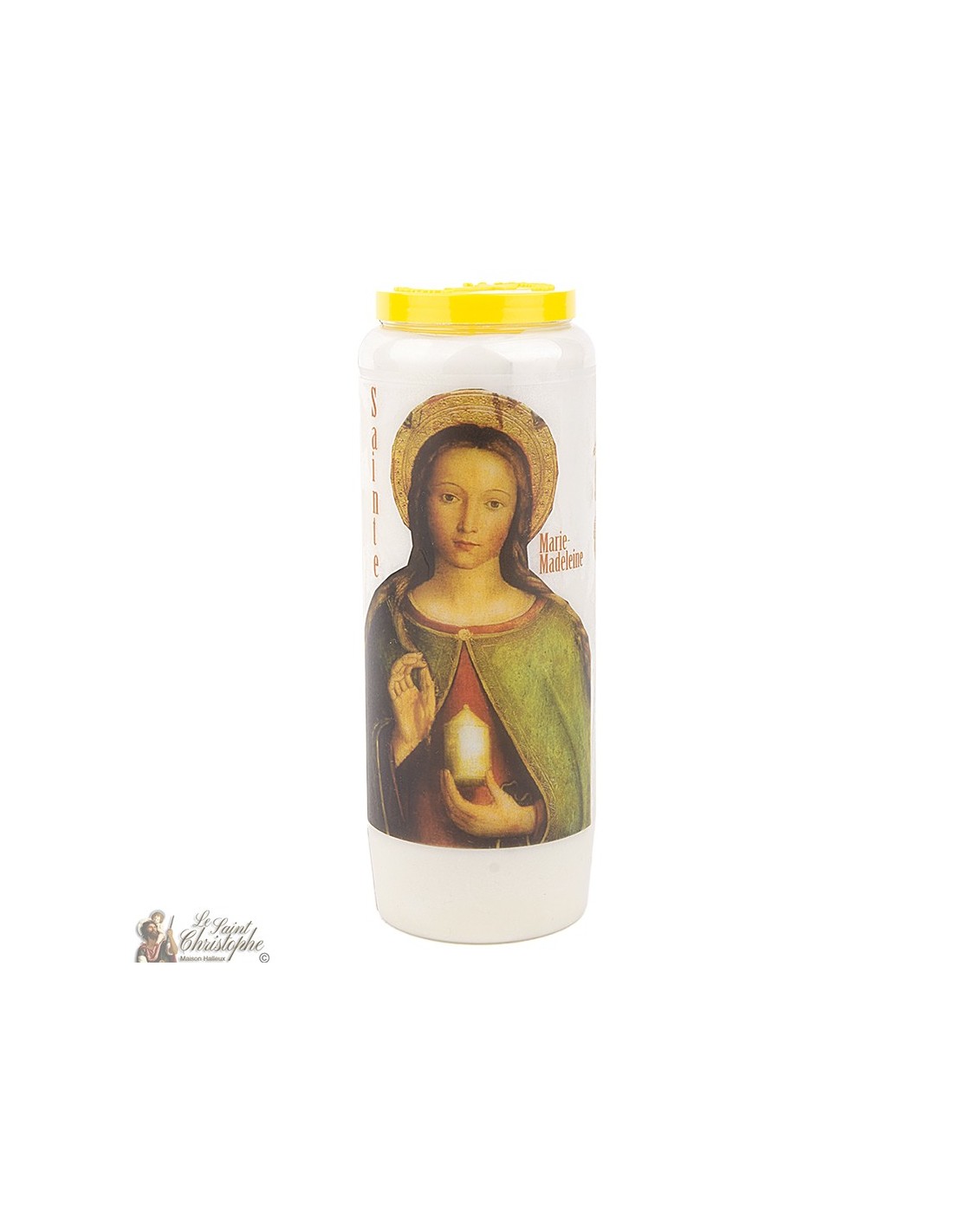 Candela bianca della novena con l'immagine di Santa Maria Maddalena e la preghiera a lei dedicata.