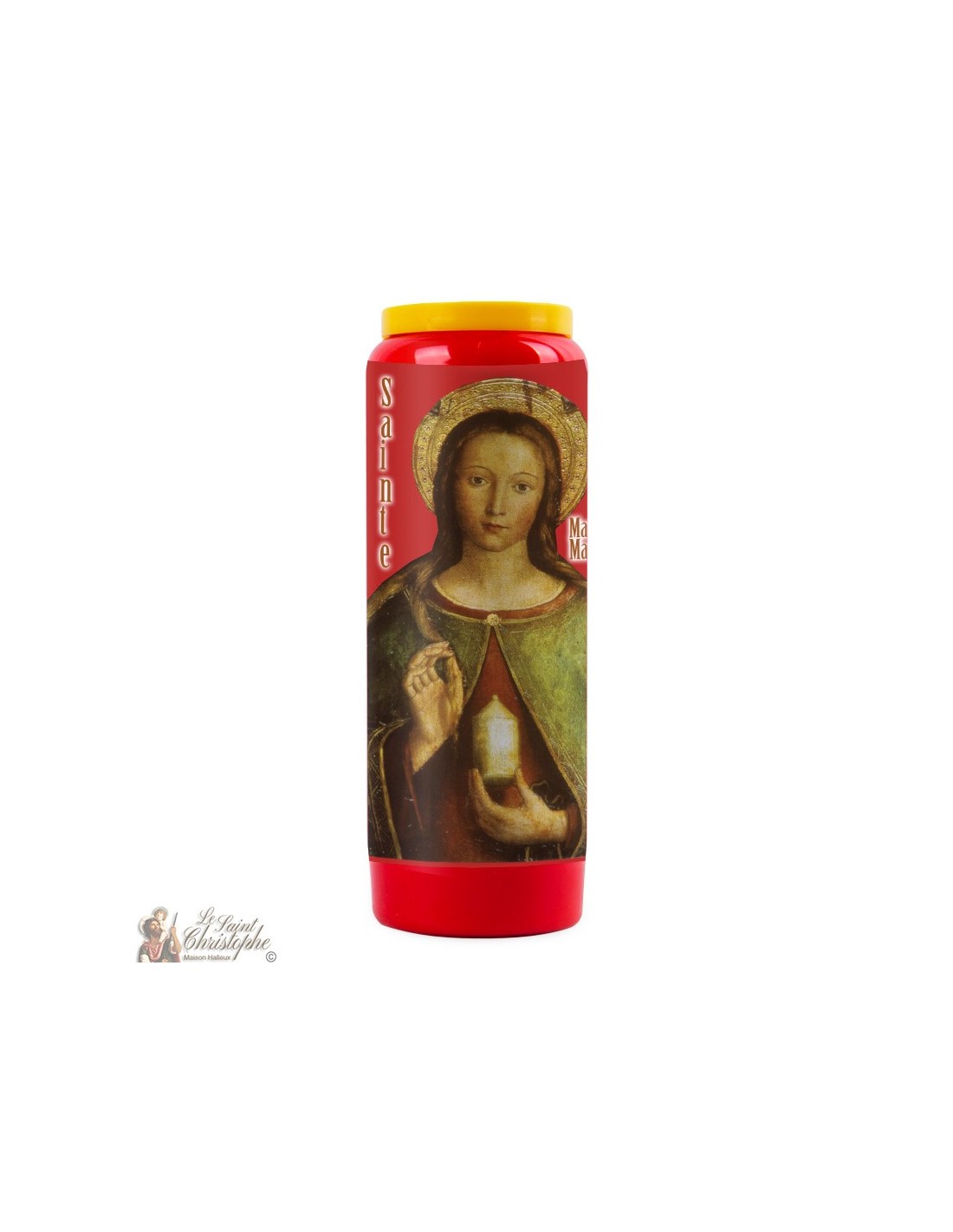 Cero della novena rossa con l'immagine di Santa Maria Maddalena e una preghiera a lei dedicata.
