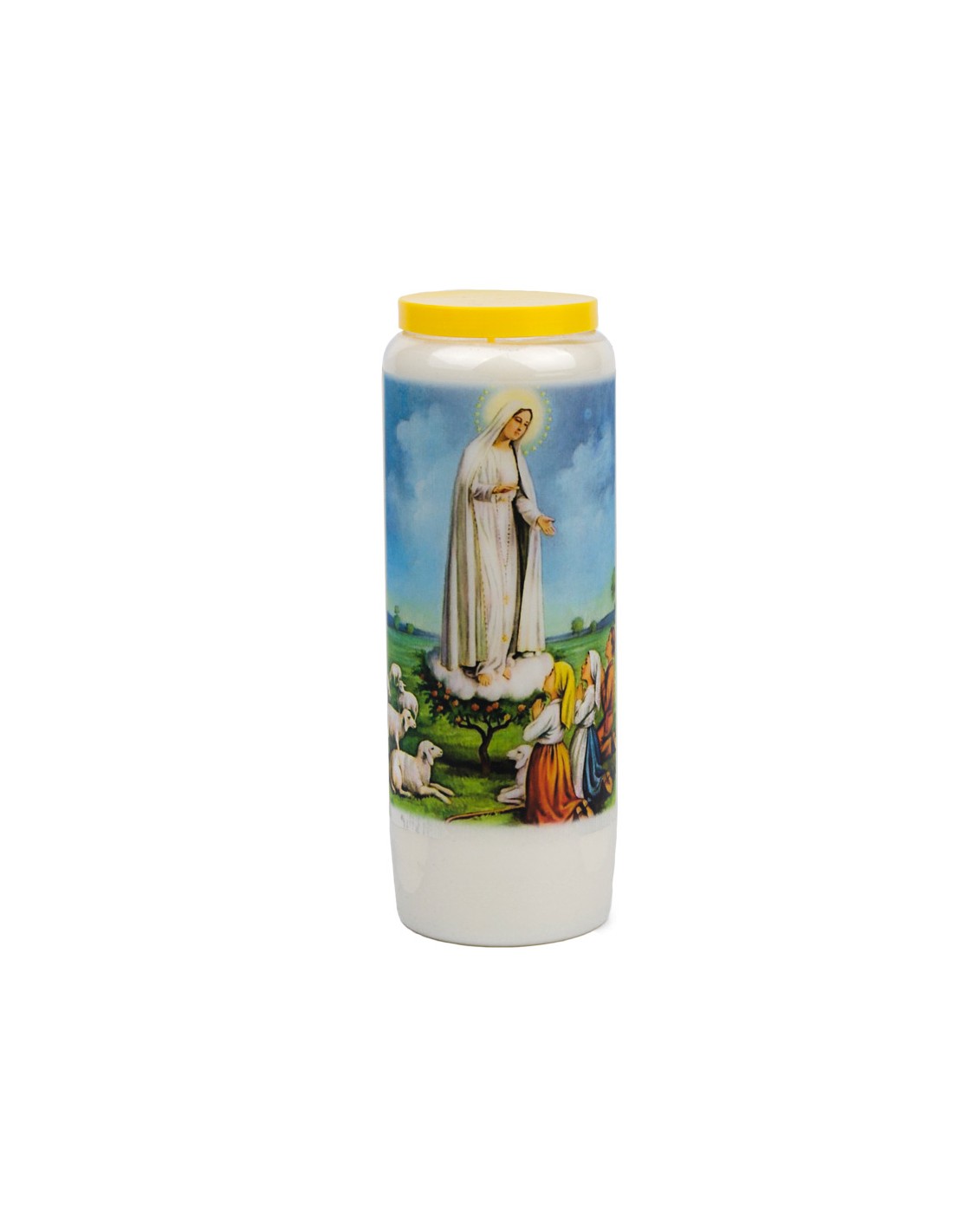 Candela della Novena con l'immagine della Madonna di Fatima circondata da rose e preghiera sul retro.