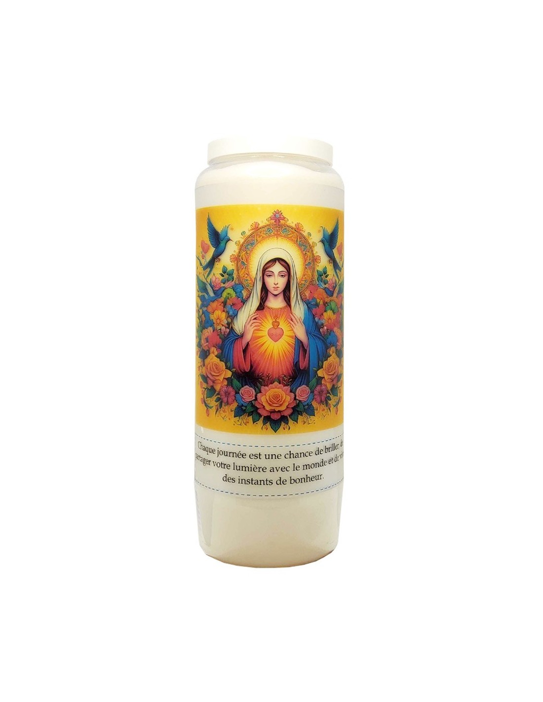 Candela della novena con immagine moderna del Sacro Cuore di Maria su sfondo giallo brillante e preghiera sul retro. La Vergine Maria è raffigurata con una bellissima aureola, circondata da rose e uccelli.