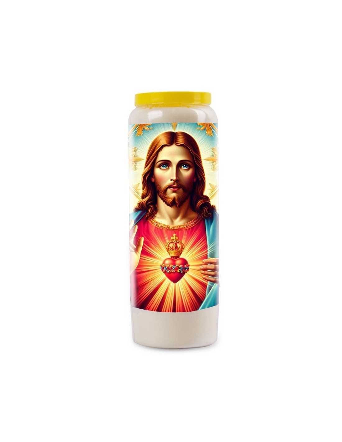 Cero della novena con immagine moderna del Sacro Cuore di Gesù su sfondo luminoso e preghiera sul retro. Cristo è circondato da cuori colorati portati da bellissimi uccelli dorati.