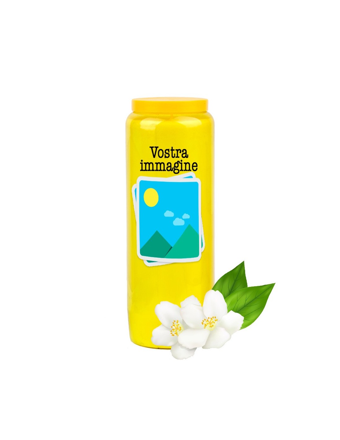 Candela novena gialla in olio vegetale al profumo di gelsomino, personalizzabile con la tua immagine e testo. Il profumo del gelsomino riduce lo stress e fornisce una migliore qualità dell'aria.