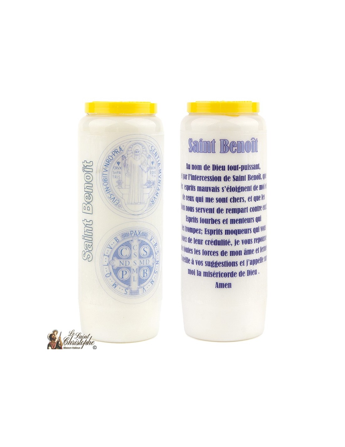 Candela bianca della novena con l'immagine della medaglia di San Benedetto in blu e la preghiera a lui dedicata.