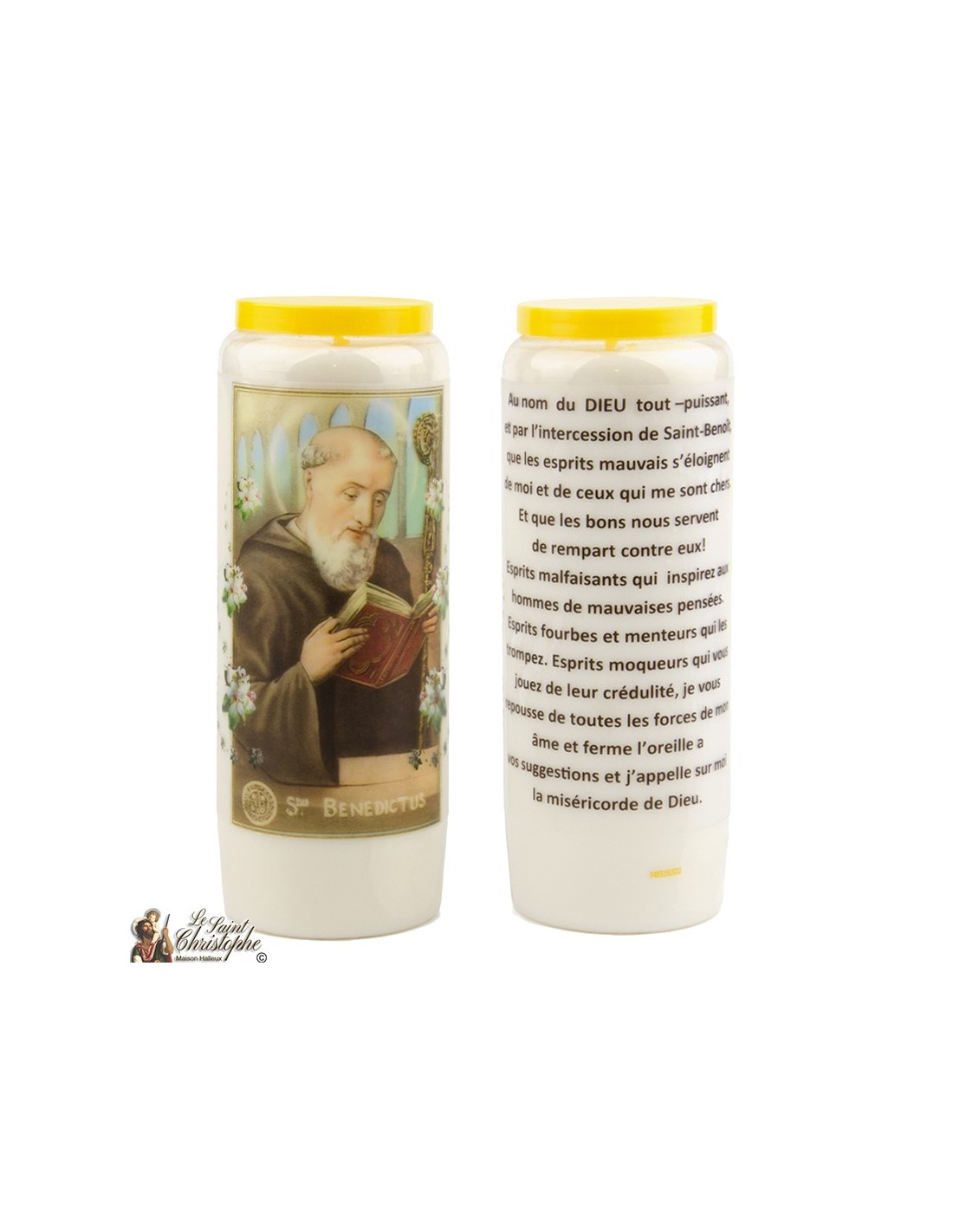 Candela bianca della novena con l'immagine di San Benedetto e una preghiera a lui dedicata.