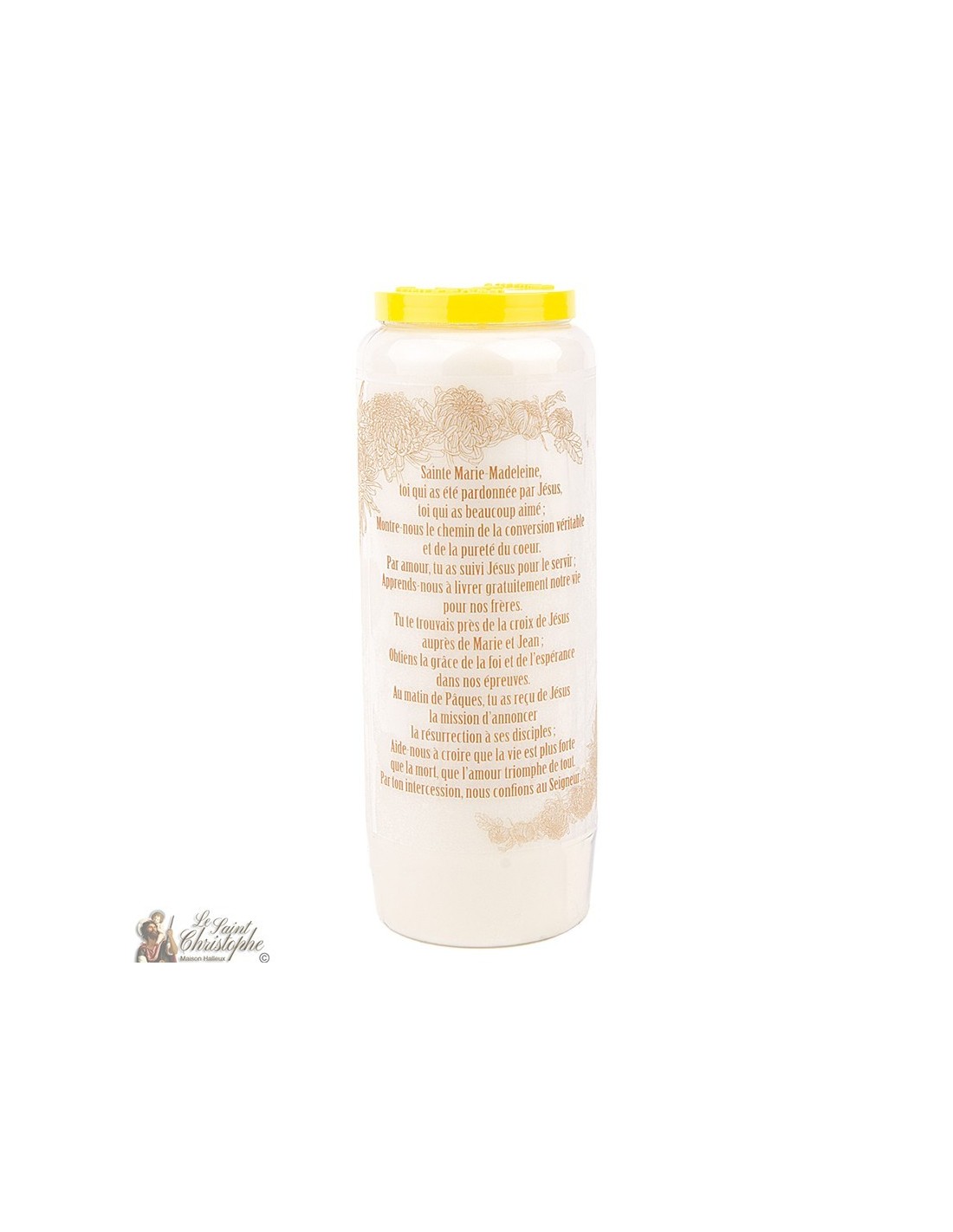 Candela bianca della novena con l'immagine di Santa Maria Maddalena e la preghiera a lei dedicata.