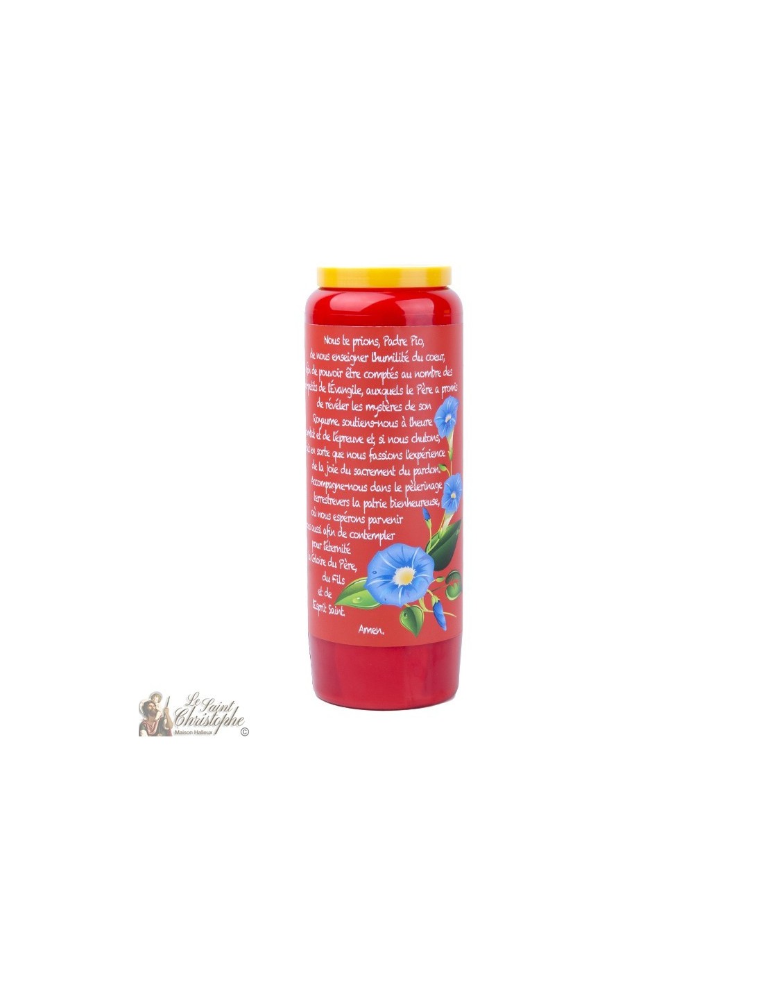 Cero della novena rossa con l'immagine di Padre Pio e una preghiera a lui dedicata.