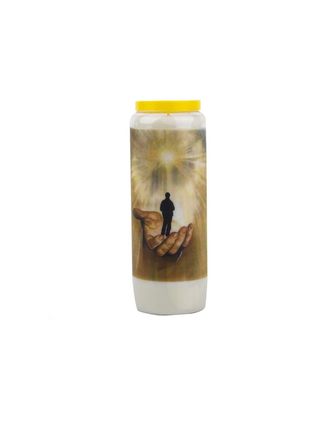 Scatola da 20 candele bianche da novena, dedicata al Santo Padre, Dio Onnipotente, con immagine e preghiera sul retro.