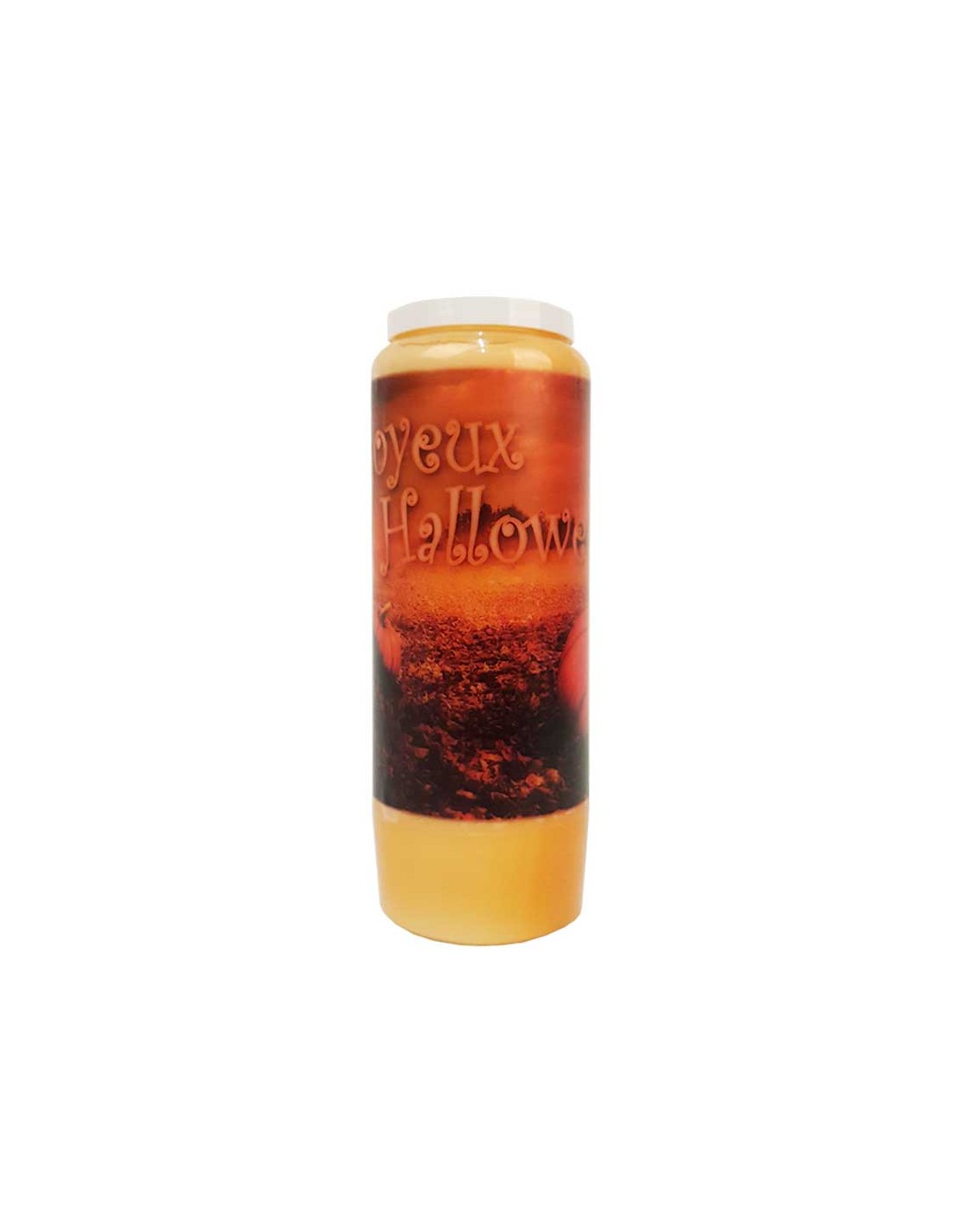 Candela novena arancione con zucche nella foresta e la scritta Happy Halloween. L'etichetta è traslucida per un effetto fotoforo.