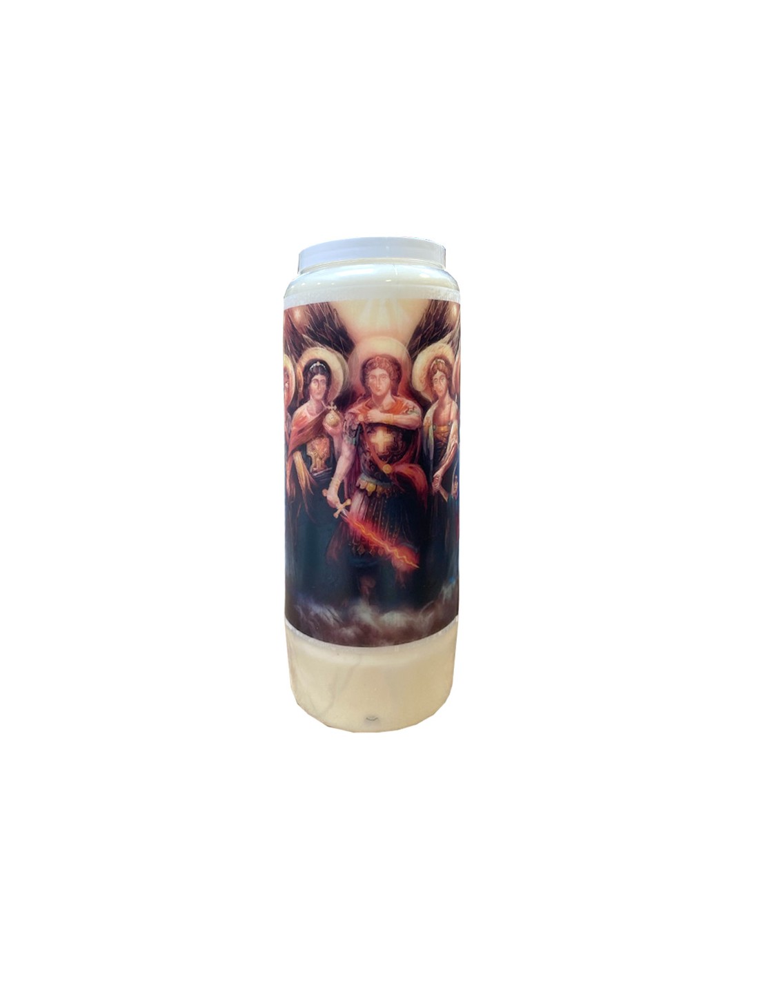 Candela novena profumata alla mirra con immagine dei 7 arcangeli. Gli arcangeli sono guide, protettori e guaritori dell'anima. La combinazione di mirra e dei 7 arcangeli purifica l'aria e aiuta a guarire.