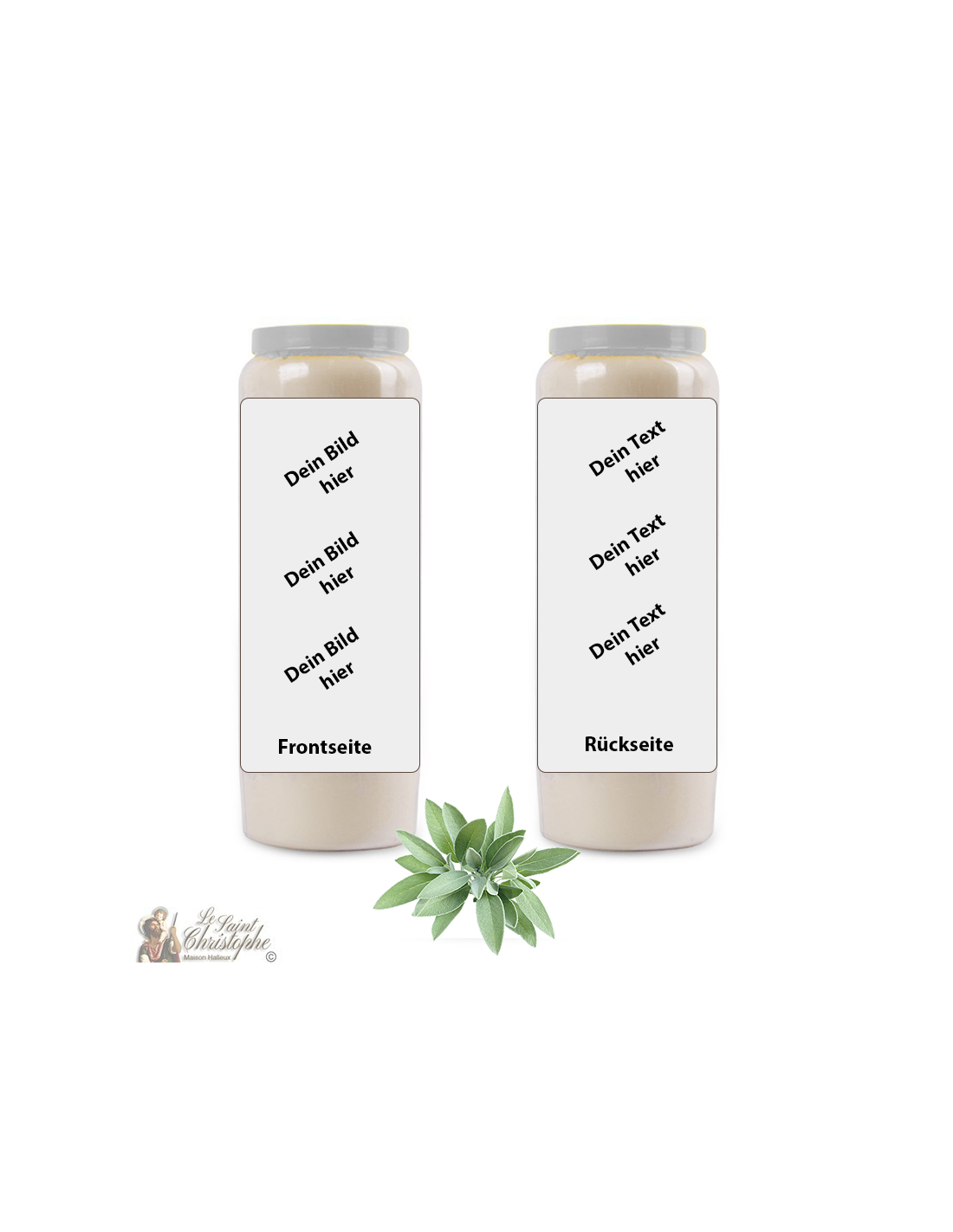 Witte noveenkaars met naar salie geurende plantaardige olie, personaliseerbaar met uw afbeelding en tekst.