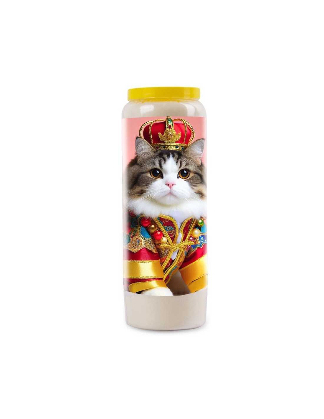 Breng een vleugje elegantie en originaliteit in huis met deze unieke noveenkaars, waarop een majestueuze kat in een weelderige koninklijke outfit staat afgebeeld.