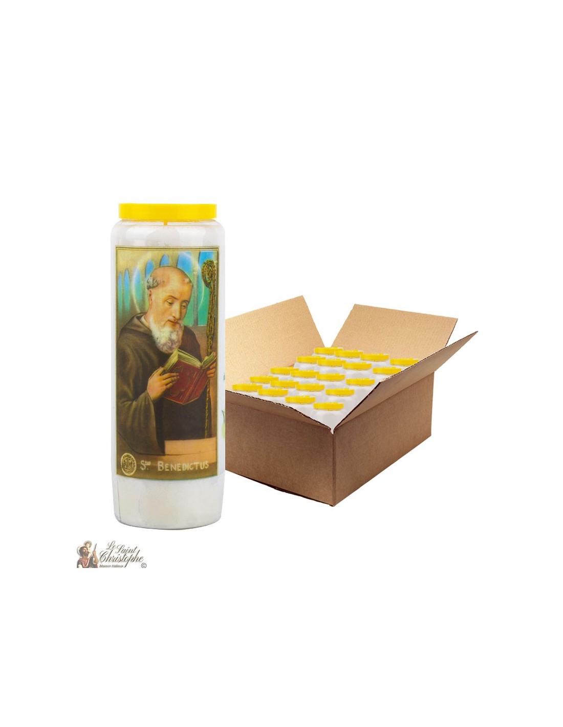 Witte noveenkaars met afbeelding van St. Benedictus en gebed opgedragen aan hem.