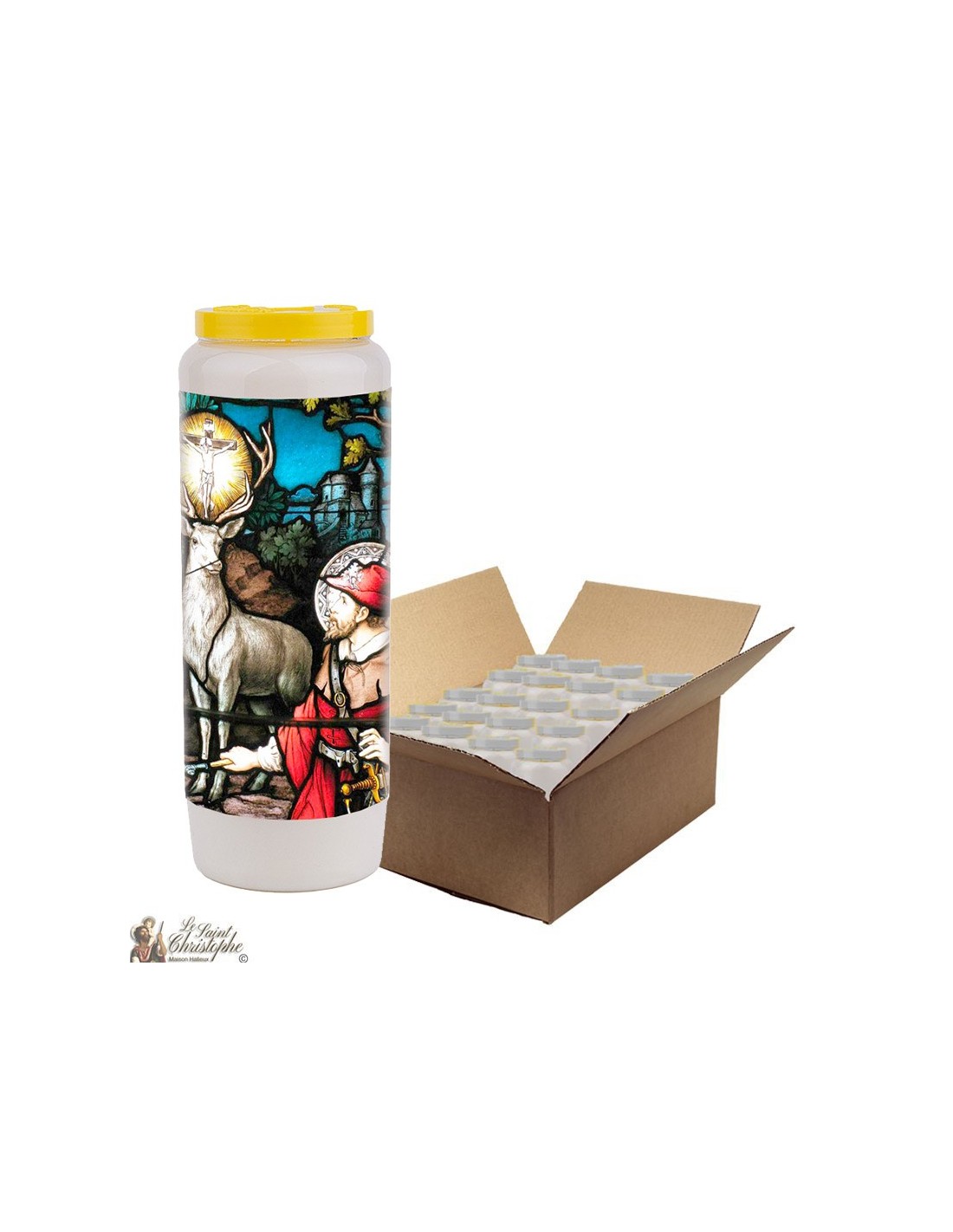 Plantaardige noveenkaars met een afbeelding van Sint Hubertus en een gebed op de rug in de taal van uw keuze. Een doos bevat 20 novenenkaarsen.