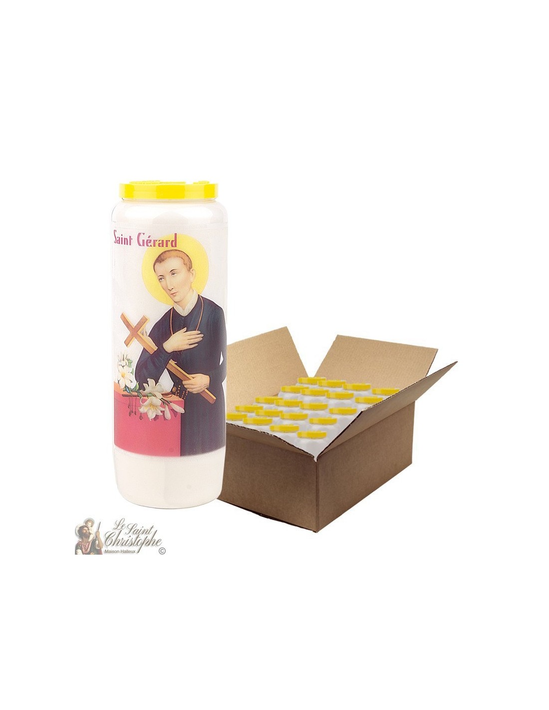 Witte noveenkaars met de beeltenis van de heilige Gerard en een gebed opgedragen aan hem.