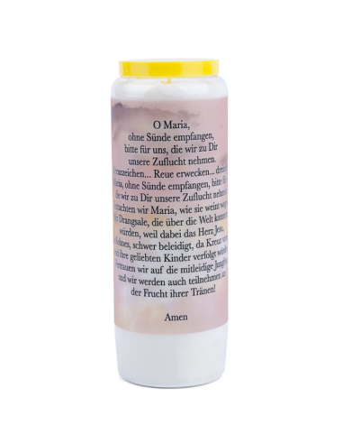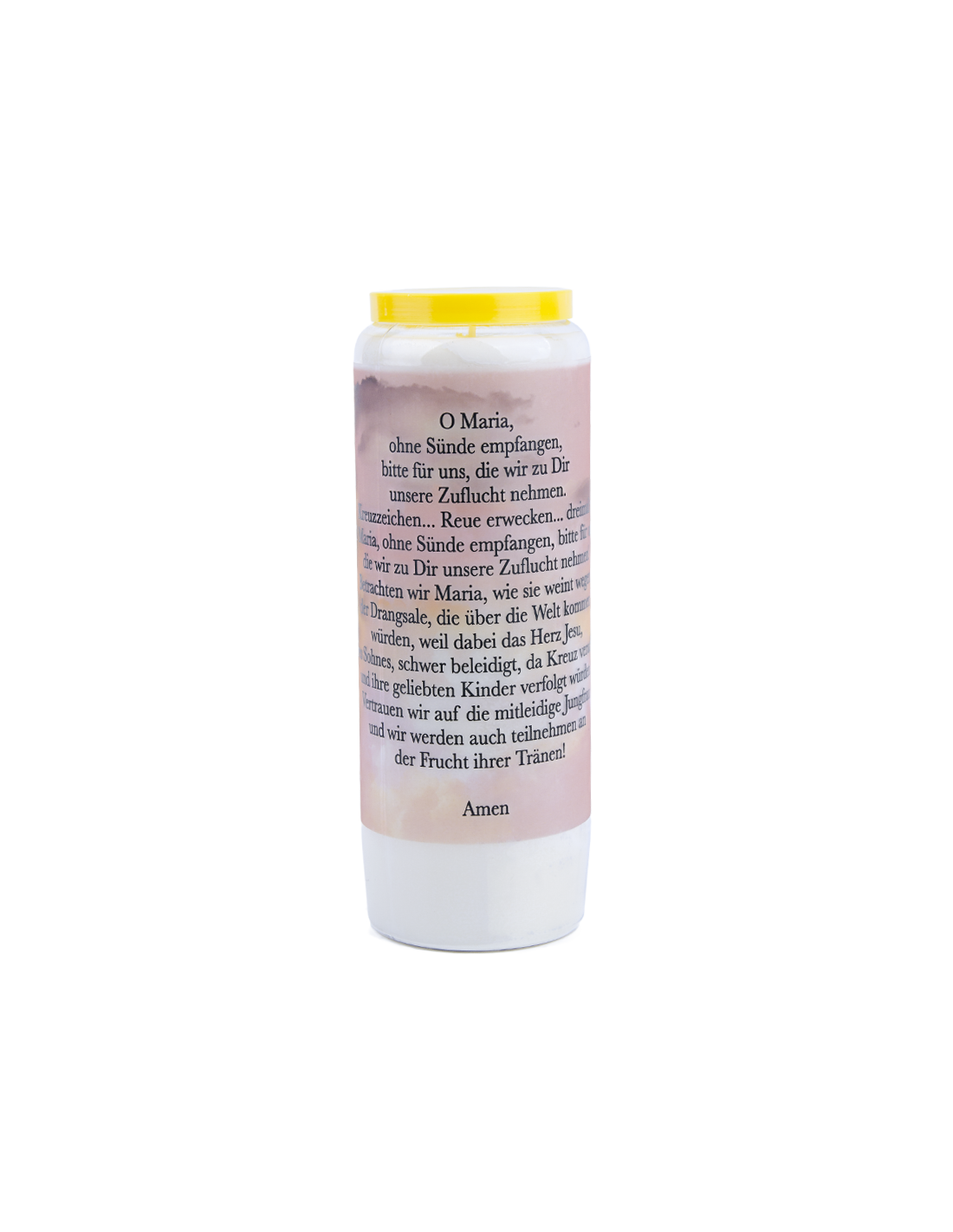 Witte noveenkaars gewijd aan de medaille van de Wonderbaarlijke Maagd en gebed op de achterkant.