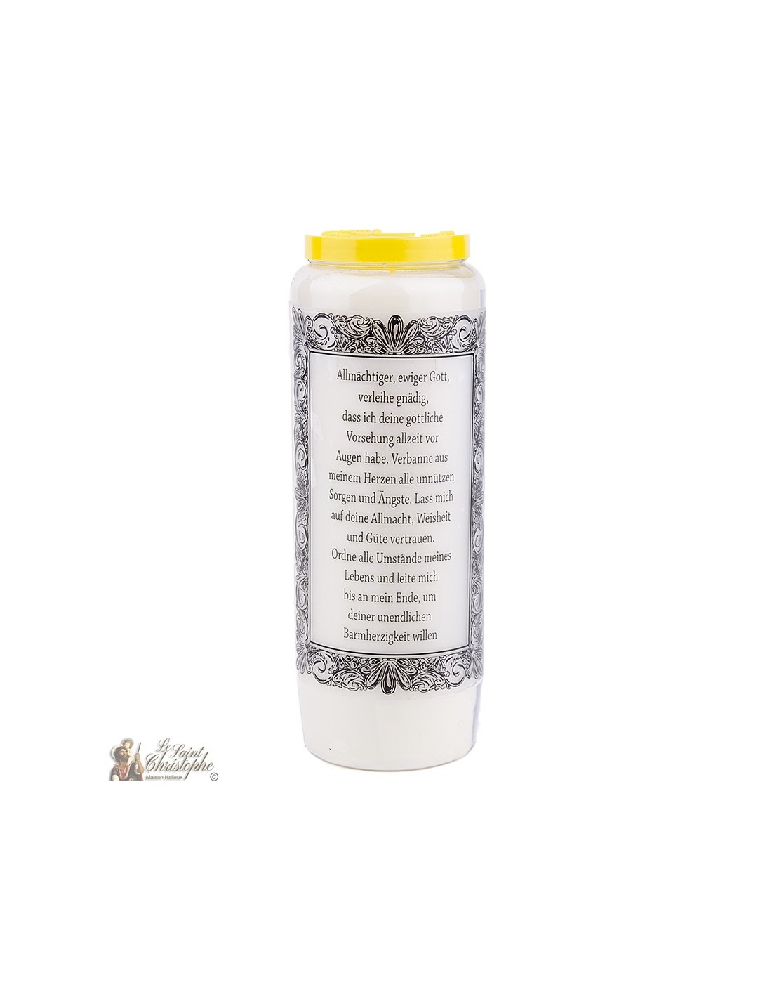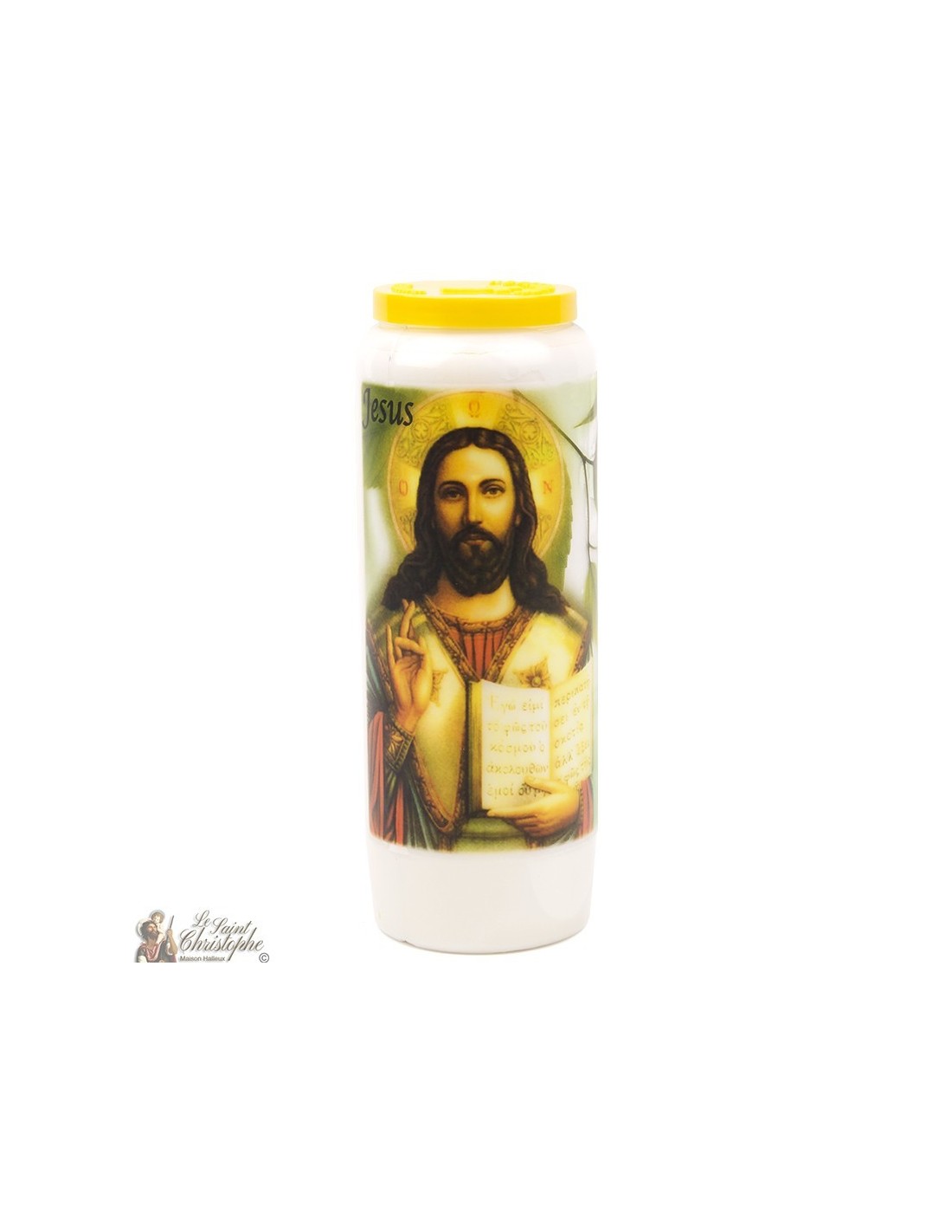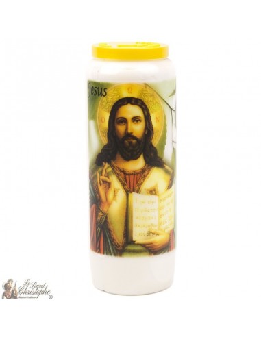 Witte noveenkaars met de afbeelding van Jezus Christus en ingelijst gebed op de achterkant.