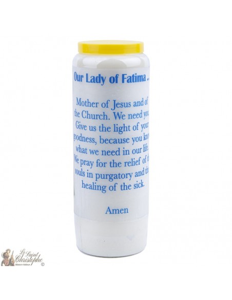Noveenkaars met afbeelding van de heilige Fatima en gebed opgedragen aan haar.