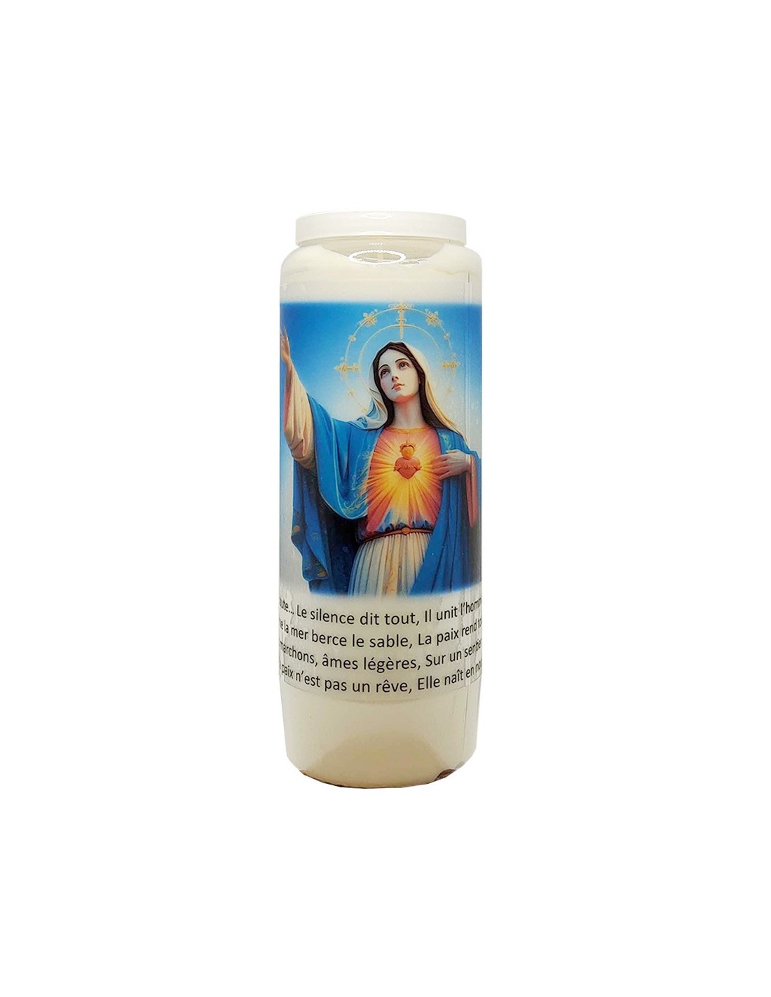 Noveenkaars met een moderne afbeelding van het Heilig Hart van Maria tegen een prachtige helderblauwe lucht, en een gebed op de achterkant. De Maagd Maria wordt afgebeeld met een prachtige gouden halo, terwijl ze naar de hemel reikt.