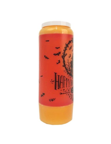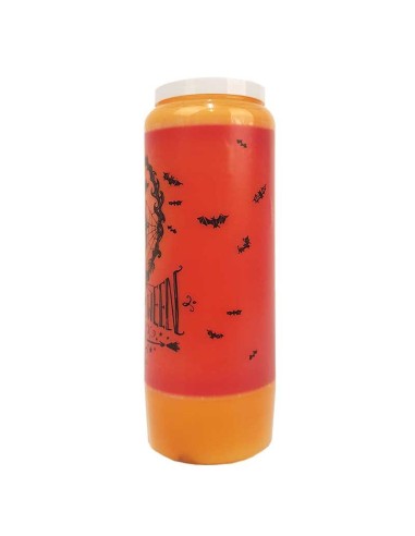 Oranje novenen kaarsen met een spookhuis motief en omringd door vleermuizen. Het etiket is doorschijnend voor een fotofoor effect.