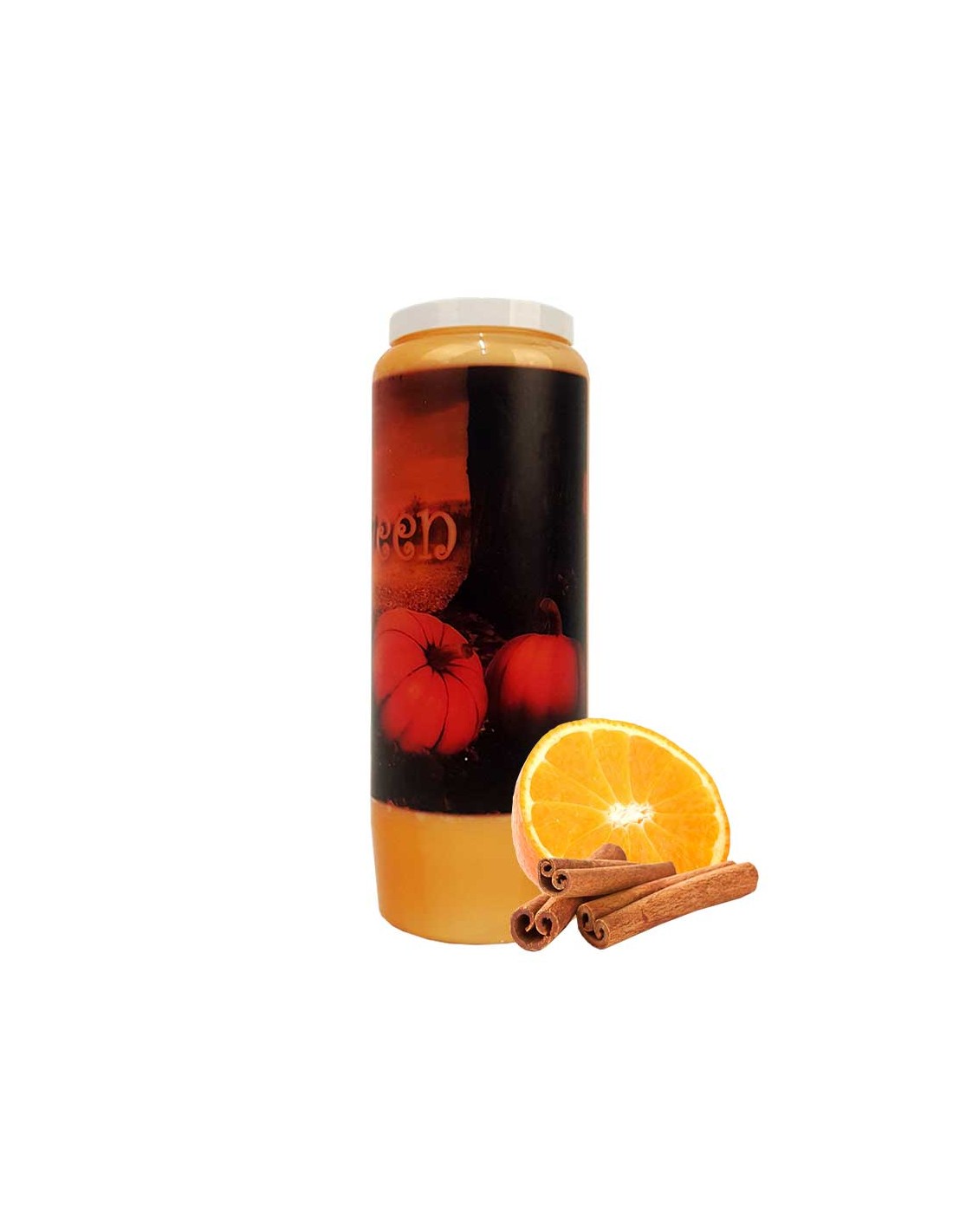 Oranje kaneel geurende novene kaarsen met een pompoen bos ontwerp en Happy Halloween erop geschreven. Het etiket is doorschijnend voor een kaars effect.