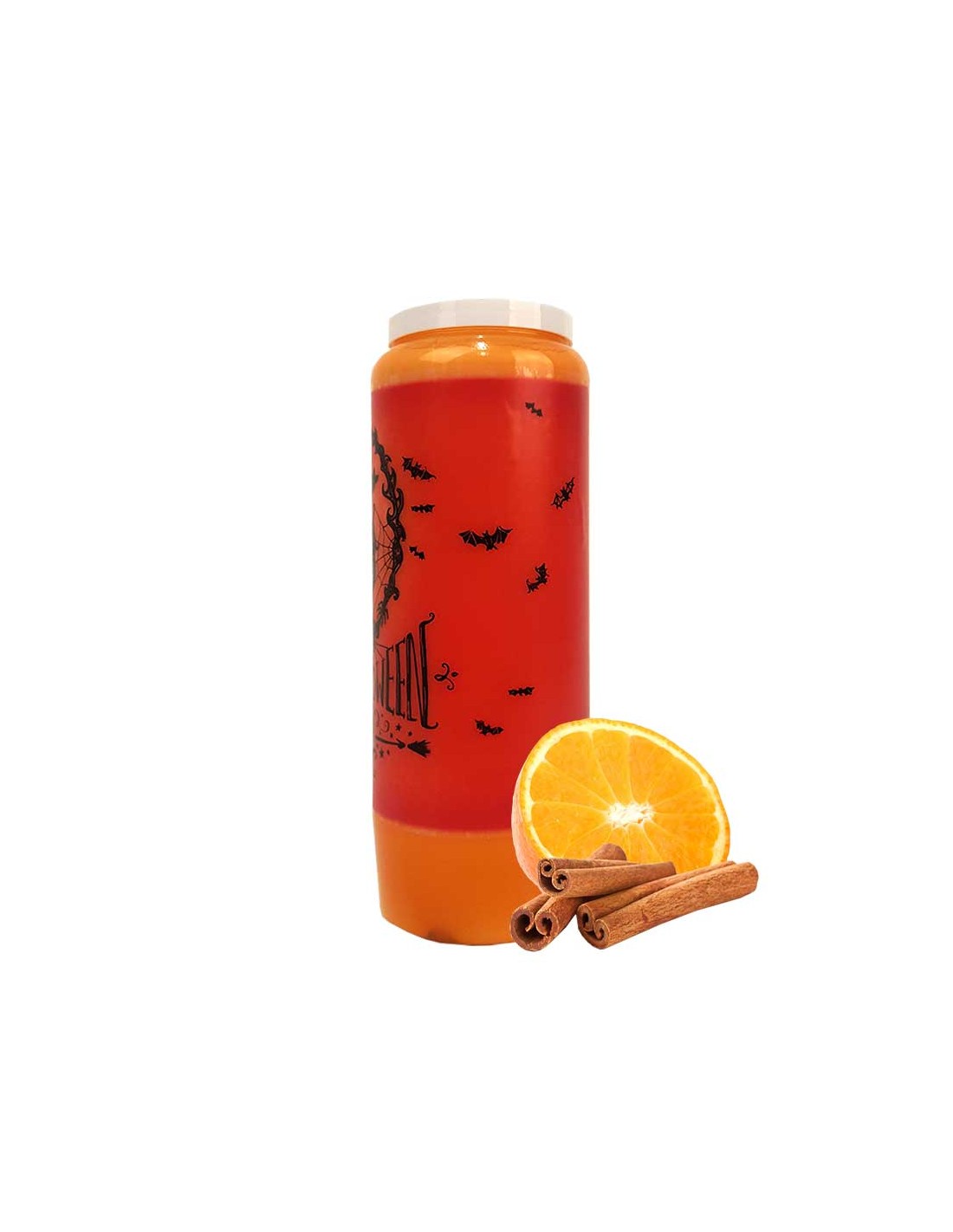 Oranje kaneel geurende novene kaarsen met een spookhuis ontwerp en omringd door vleermuizen. Het etiket is doorschijnend voor een fotofoor effect.