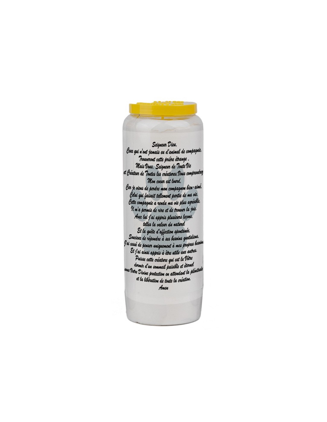 Plantaardige noveenkaarsen met het beeld van een zwarte hond en een gebed voor een verloren huisdier, waarbij God wenst dat hij er over waakt.